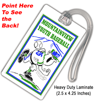 Custom designed sports bag tags can be an economical and functional memento of a player's participation in a tournament or league. They can also be a unique way to celebrate achievement, like "Player of the Game". Featuring heavy duty lamination and a durable vinyl luggage loop, these sports bag tags are manufactured using quality components. A player's name, team and phone number can be easily added to the backs of our non-personlaized bag tags with a permanent marker! |