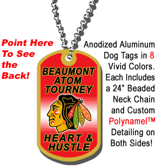 Our customized, two-sided Dog Tags are a popular and economical keepsake. Colorful, PolynamelTM detailing on both the front and back of the tag offer the opportunity to create unique, exciting and personalized graphics for your players. Now available in 8 colors of Anodized Aluminum to compliment your association's colors - Red, Blue, Green, Black, Gold, Siver, Purple and Hot Pink! 24 inch Nickel Plated beaded neck chains included. |