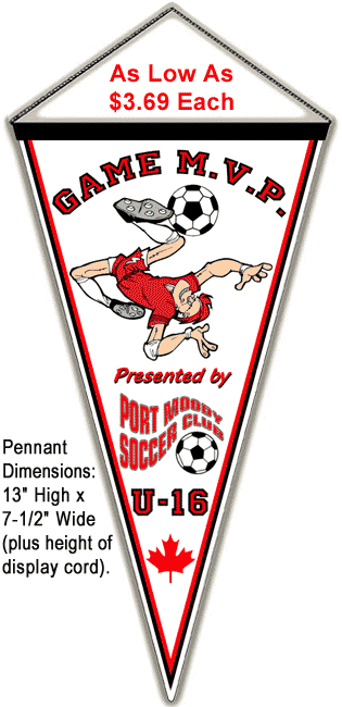 Our Pennants and Mini Stadium Banners offer a great alternative to conventional awards, and are extremely economical. Available in two popular formats, these awards can either feature the names and jersey numbers of all of the players on a team and their coach(es) or they can feature the names of all of the teams that are competing in a tournament or league. Press the Browser arrows to see various Pennant and Mini Stadium Banner examples. |