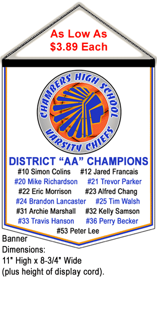 For Larger Quanitities, We Will Quote. Add 25 cents per pennant or banner to personalize with individual players' names or team rosters. Free Shipping for Orders Over $750.00! |