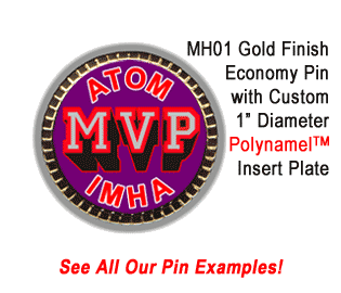 Custom designed Souvenir Pins are a traditional and economical choice. Heavy duty construction, with military clutch back and non-swivel spur. Let us design a unique, full color pin to commemorate your tournament, league or school's next special event. These compact awards can even be PERSONALIZED! |