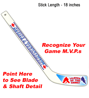 Now you can have high quality plastic mini hockey sticks customized for your tournament or league. Each stick features brilliant PolynamelTM detailing on both the blade and shaft of the hockey stick. A great award for any player to receive! |