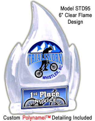 Any trophy shop can sell you awards that are labelled with boring generic decals and standard engraving, but at betterawards.com we bring low cost acrylic trophies to life with great looking custom designed graphics! Each of our trophies feature a pair of brilliant PolynamelTM plates, customized with your group's emblem and colors. Why settle for generic looking trophies, when you can have these popular and economical awards personalized for all of your events? |